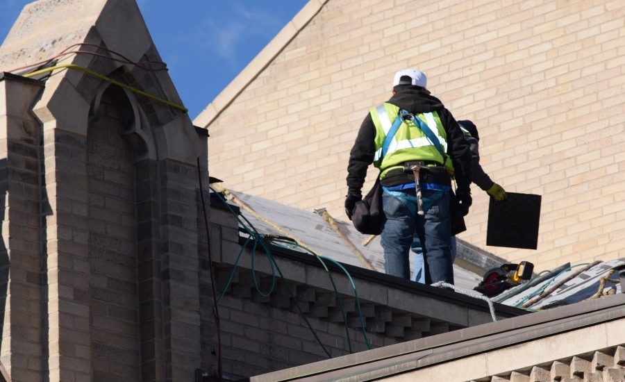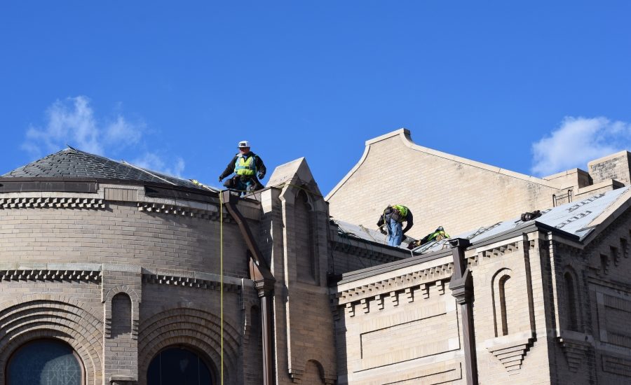 “With the height of the cathedral and the 18 on 12 pitched roof on Robert’s Hall and Parish Hall, the crews’ safety was a major concern,” says McMillan. “Our employees were tied off at all times for both fall protection and to traverse the different building slopes. On the ground we had team members taking extra precautions to make sure that pedestrians stayed a safe distance away from the work areas.”
