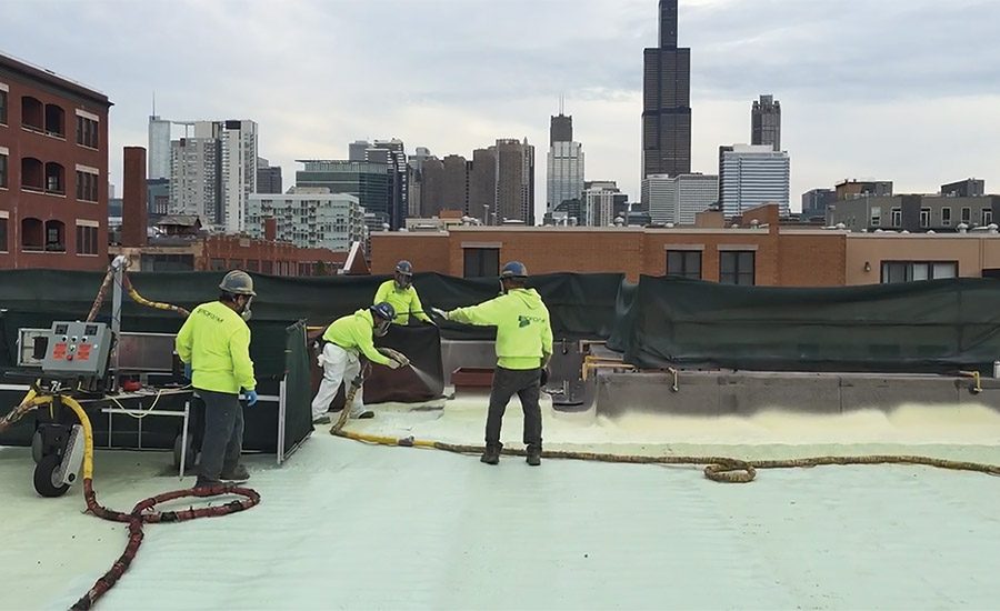 It’s taken time for spray foam roofing to catch on in the Chicago market, but BIOFOAM’s crews are working on more and more of the region’s old factories and warehouses that are being converted into residential and retail spaces. Photos courtesy of BIOFOAM.