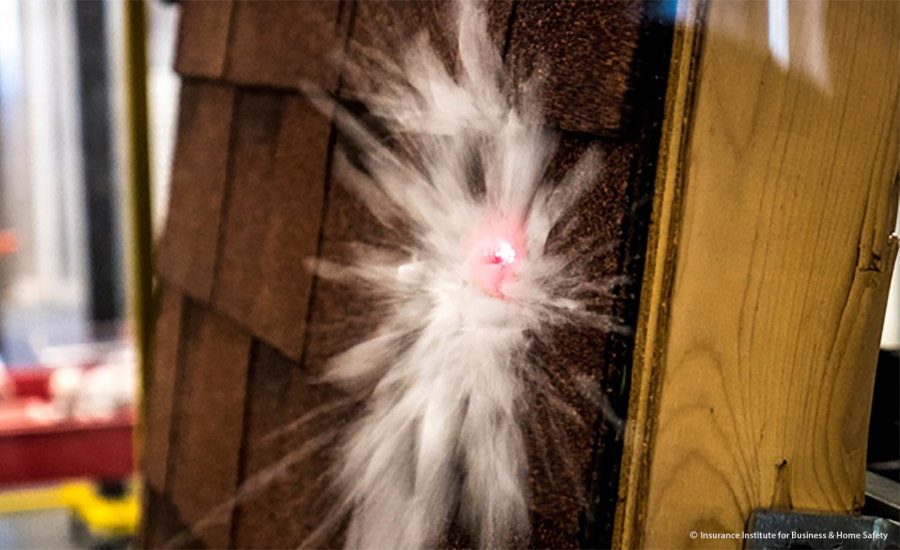 The moment a hailstone impacts against a shingle in the IBHS testing facility.