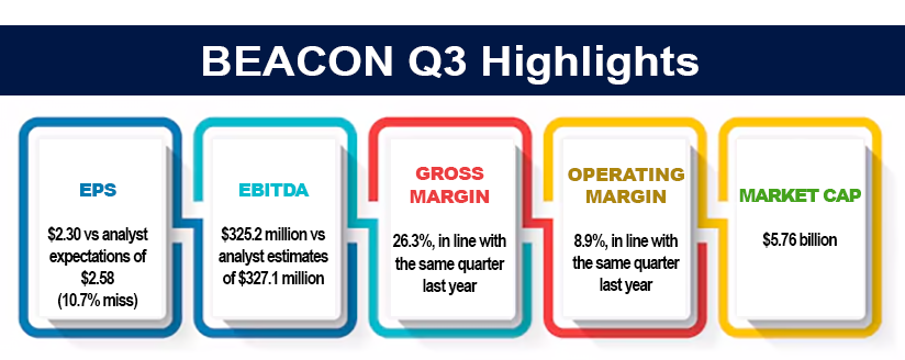 Beacon Roofing Supply (NASDAQ: BECN) reported third-quarter net income of $145.3 million after reporting a loss in the same period a year earlier; on a per-share basis, the Herndon, Va.-based company said it had profit of $2.30 and earnings, adjusted for one-time gains and costs, were $2.80 per share.