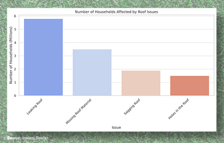 Meanwhile, missing roofing materials, which impact 3.5 million households, and sagging roofs, affecting 1.9 million, further compound the risk of extensive damage. Although holes are less common, reported in 1.5 million households, they underscore the need for regular professional inspections.