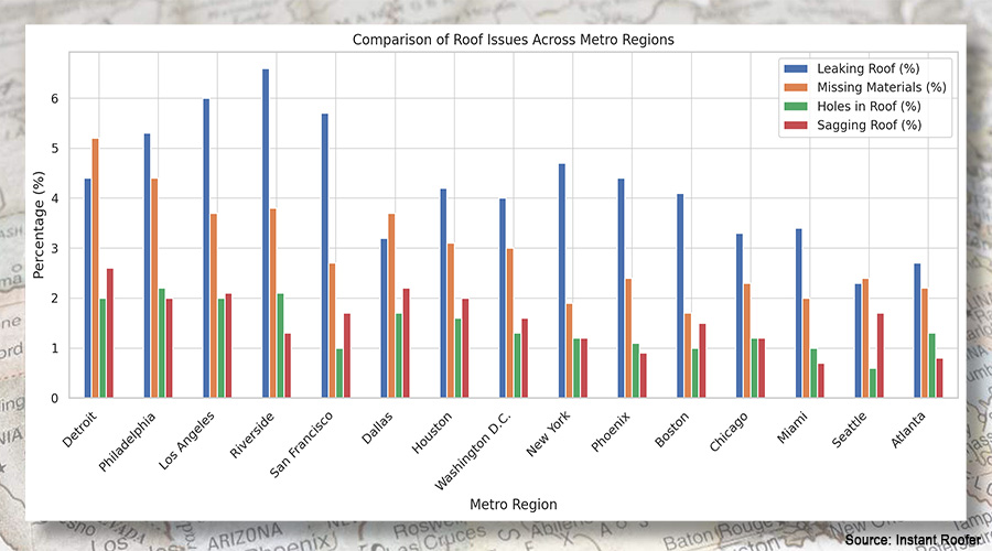 A study by Instant Roofer reveals major roofing issues in U.S. metros, with Detroit, Philadelphia and Los Angeles ranking worst. Contractors can target high-risk areas, promote inspections and adapt services to regional needs.
