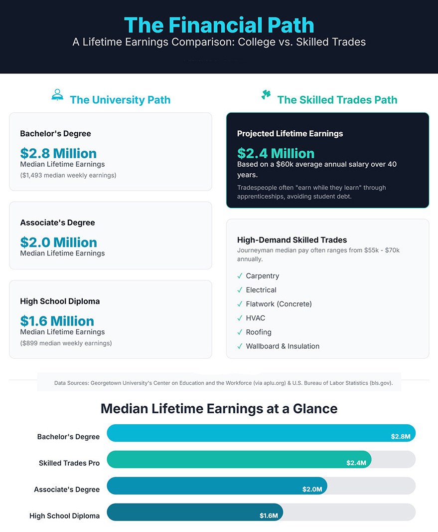 Bachelor’s graduates tend to surpass trades in earnings over 20–30 years. Still, with average student debt around $30,000 and median starting salaries for college grads stagnating, the appeal of earning while learning has never been stronger.