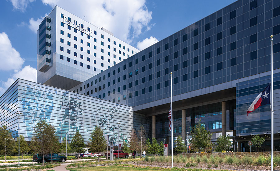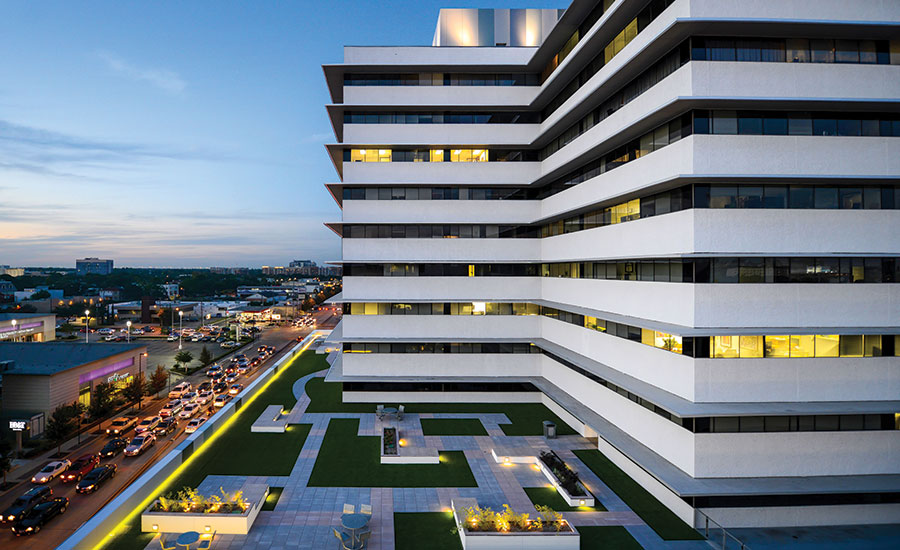 Chamberlin Roofing & Waterproofing is accustomed to taking on challenging projects, including the Gulf States building and the new Parkland Memorial Hospital in downtown Dallas (below). At right is the multi-story Art-Deco Kirby office development in Houston’s Greenway Plaza, originally built in the 1960s.