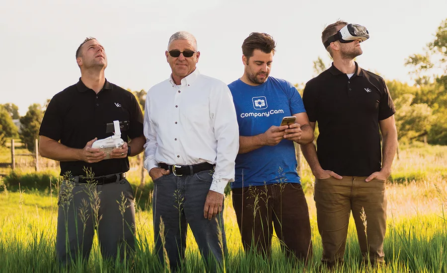 Drones, smartphones, apps and virtual imaging were among the technological advancements the next generation of Hansens added when White Castle Roofing Co-Founder Mike Hansen (white shirt) handed them the bulk of strategic planning and marketing responsibilities. From left are his sons, Dane, Luke and Jake. Photo by Jared Goertzen.