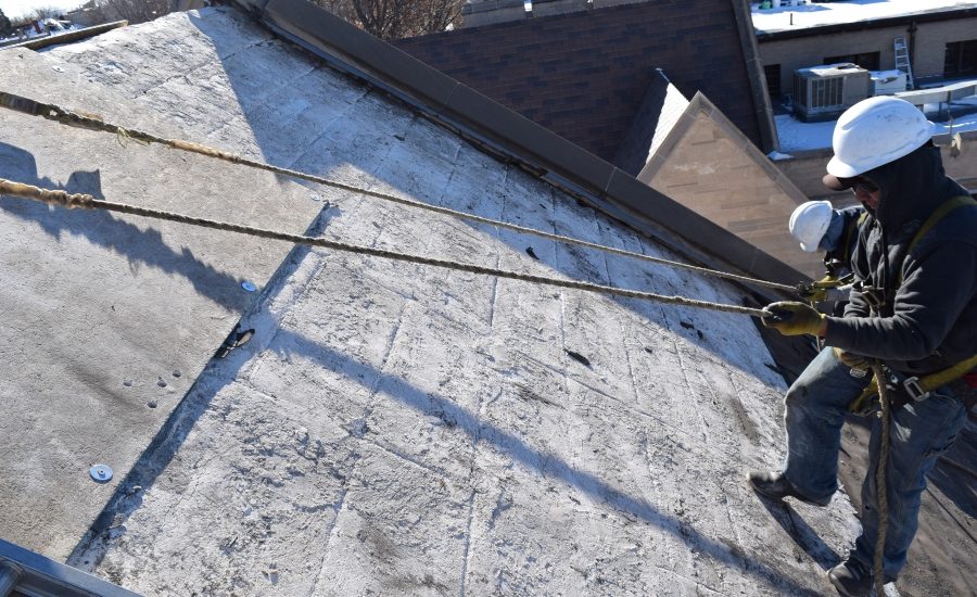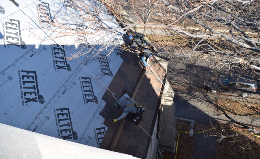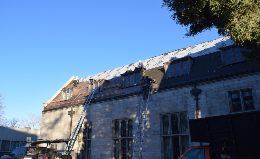 “With the height of the cathedral and the 18 on 12 pitched roof on Robert’s Hall and Parish Hall, the crews’ safety was a major concern,” says McMillan. “Our employees were tied off at all times for both fall protection and to traverse the different building slopes. On the ground we had team members taking extra precautions to make sure that pedestrians stayed a safe distance away from the work areas.”