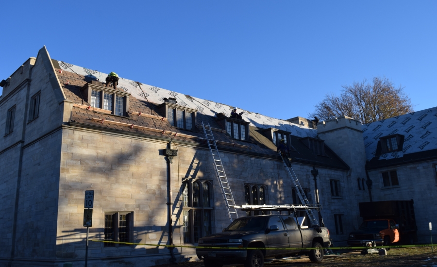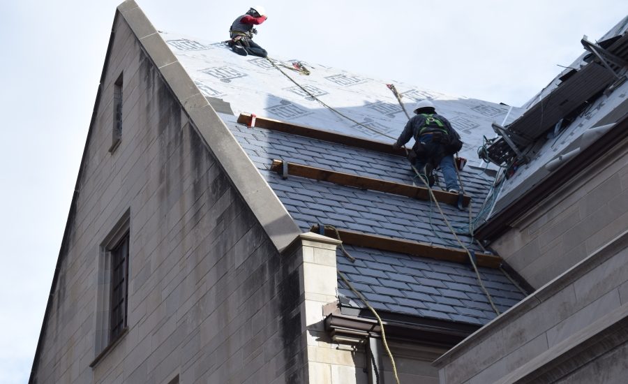“Every structure in this project had its own unique set of challenges,” says McMillan. “As we moved to Robert’s Hall, failing copper nails had allowed the heavy slate to detach and fall to the ground. The remaining old slate shingles had to be individually hand-removed.