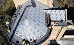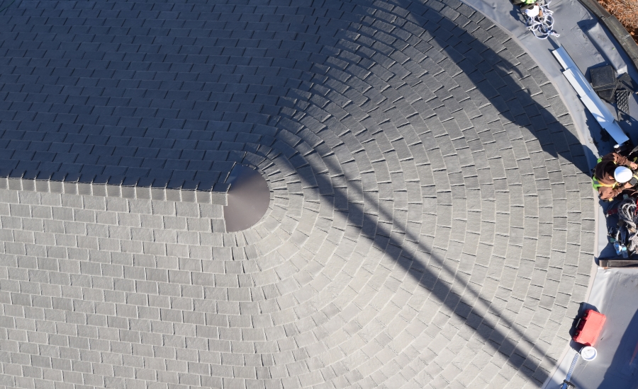 “We consulted with an engineering firm to determine that the existing gypsum under the slate needed to be covered with OSB to provide a suitable nailing surface for the DaVinci tile. We decided that a toggle bolt system was the best option. This meant we had to assemble 3,864 toggle bolts and then pre-drill the installed OSB with ¾-inch holes. Seventy drill bits were worn out during this phase.”
