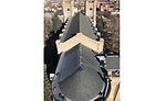 “When we inspected the cathedral, the only roof access involved climbing an old wooden 90-foot ladder originally installed in 1910. Once we reached the top of the bell tower, we had to balance on a coffee can. We steadied ourselves on the bell yoke and then squeezed through a two-foot by two-foot vent opening. That was quite a challenge!”