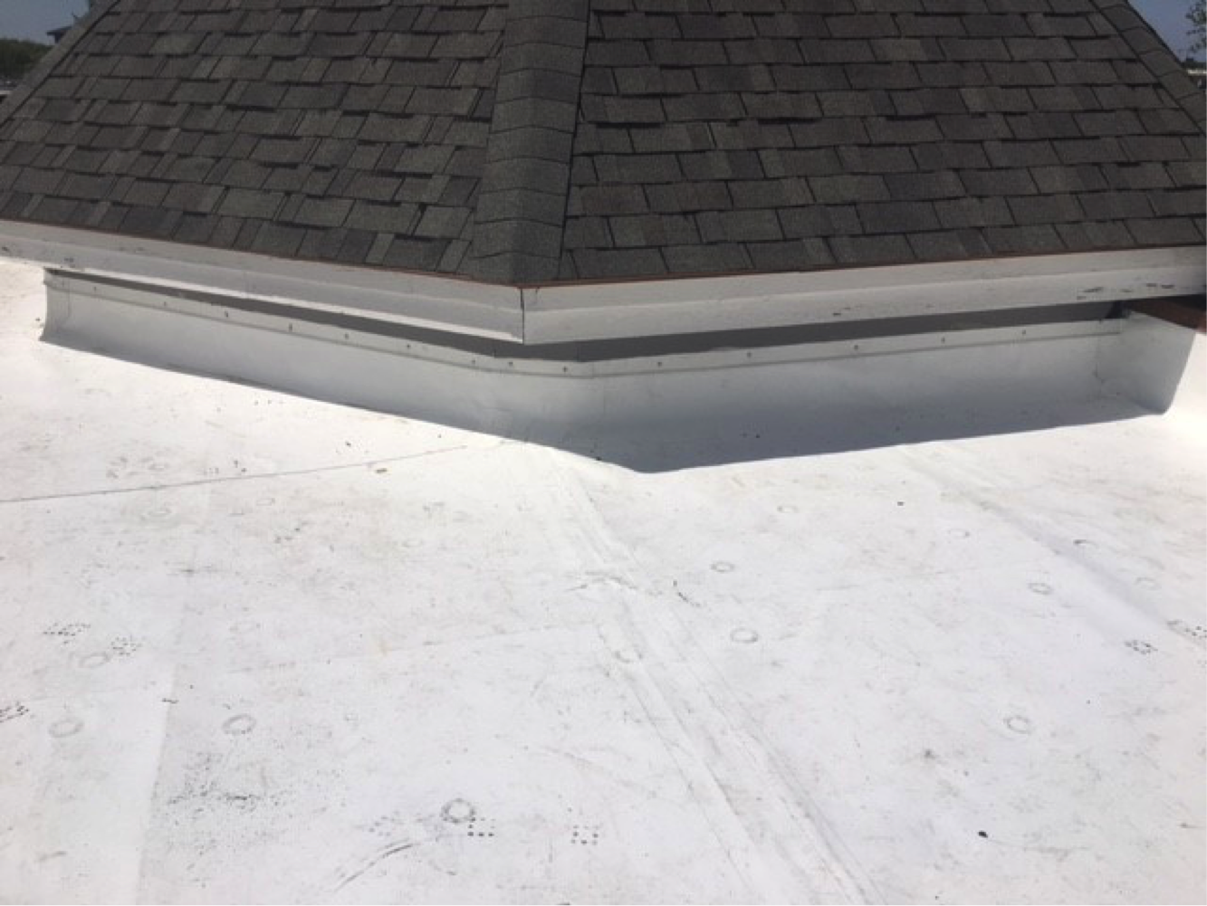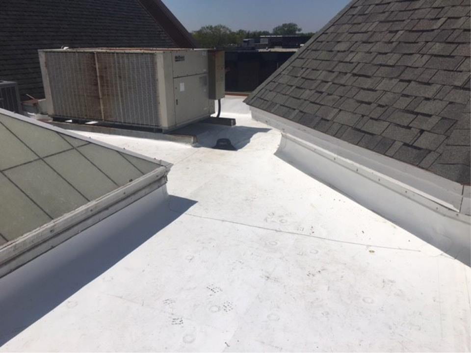 Rod Petrick, Ridgeworth Roofing’s president and owner, said that Bennett & Brosseau’s team worked on the steep slope repairs while his company handled the reroofing of the house’s four-story flat roof section. Additionally, it also did a skylight restoration that included a cleaning, a replacement of edge sealant and a solvent-based silicone coating that resulted in a new weathering surface.