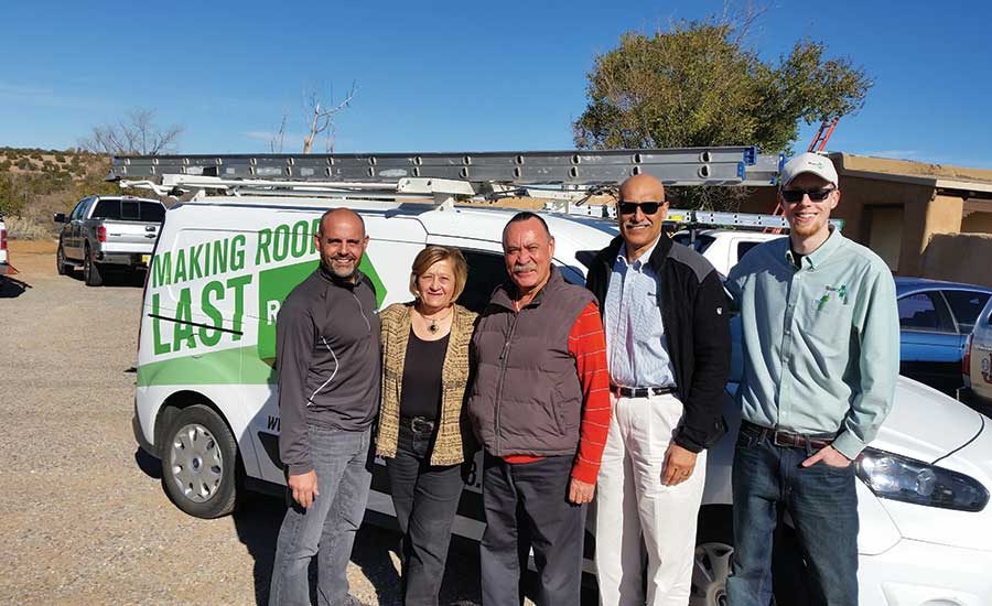 “Our goal is to serve clients in a comprehensive, organized and efficient manner, to ensure the process remains straightforward and stress-free for both parties,” said RoofCARE CEO Louis Zaina (far left). Also pictured (from left) Marsie Silvestro, exec. director of Esperanza, Jose Luis Hernandez, APOC sales representative, COO Alberto Garza, and Marketing Manager Jonathan Small outside a Roof Angel Project 2016 event. Photos courtesy of RoofCARE.