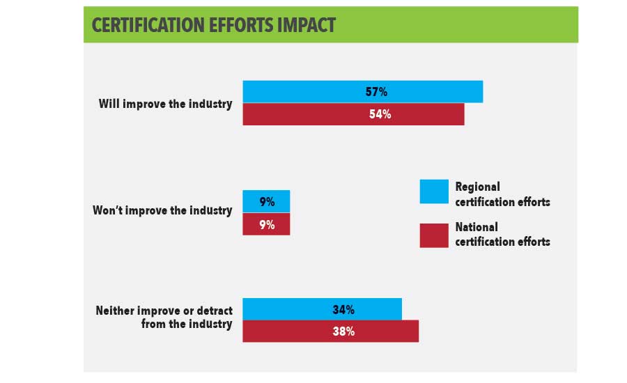 Not everyone is showing that level of enthusiasm, yet. The survey also shows the promotional effort is just ramping up. More than a third of all roofing contractors said they don’t see any impact — positive or negative — from national or regional certification programs.