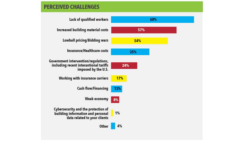 Similar to 2018’s survey and report, roofing contractors from all corners of the country said they still felt good about the overall state of roofing in terms of sales, in spite of some serious, and still unresolved issues that have both business and broad social impact. The lack of a clear direction from Capitol Hill on improving legal and illegal immigration policies continues to have an impact on an available pool of workers, and contractors also said they’re being pinched by increased labor costs and regulation.