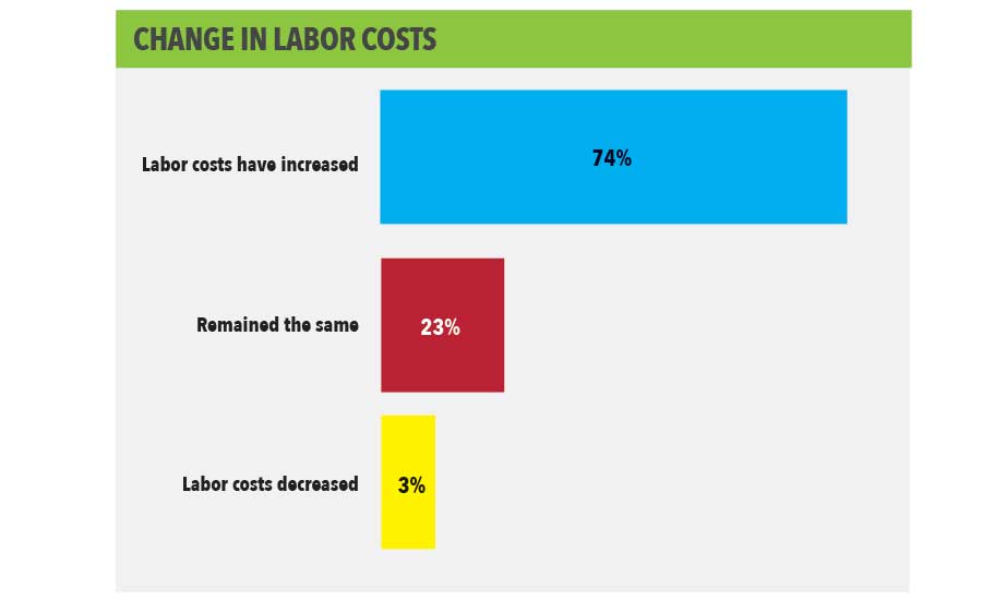 About three-quarters (74 percent) said they experienced an increase in overall labor costs since the start of 2018, and that uptick, on average, was by about 13 percent. Another 23 percent said labor costs remained the same and just three percent found costs to decrease last year.