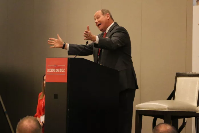 NRCA CEO Reid Ribble addresses attendees of Roofing Day in D.C. 2019 as they prepared for nearly 300 meetings with congressional staffers and members of congress.