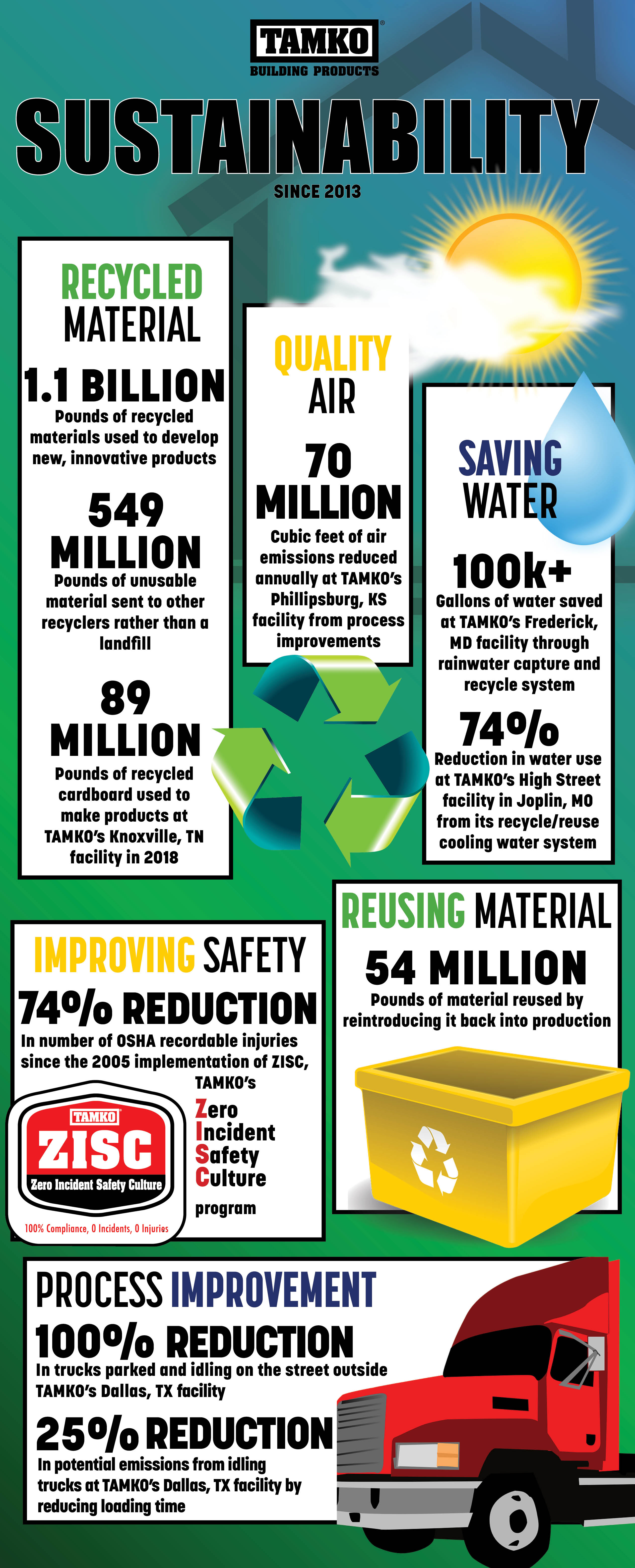 Since implementing a Zero Incident Safety Culture (ZISC) in 2005, TAMKO has reduced its number of OSHA recordable injuries by 74 percent. Through all its efforts, TAMKO continuously strives to work safely, produce quality products and protect the environment of the communities where the company operates.