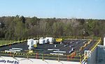 Rubber stands have a rectangular pad with a center hole where a plastic post is inserted. These stands are inexpensive and weigh about 30 pounds. They don’t have spacers on their corners so they tend to pick up roof debris which needs to be removed regularly. The narrowness of the rectangular pad reduces how far apart the stands can be spaced, requiring more stands to cover a given perimeter. Two pads are stacked on top of each other at the corners of the perimeter to meet the overturning resistance for the two edges at the corners. Some stands have small bases and must be dead weighted to meet the OSHA requirements for horizontal overturning resistance.