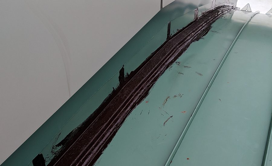 The designer should always specify penetration materials provided by the metal system manufacturer and state that these materials should be applied in accordance with the manufacturer’s requirements. The most important material component is the design of proper adhesives. Asphalt-based adhesives and cut backs are typically not compatible with metal systems and should be avoided even in emergency repair situations. Consult the manufacturer for the design guidelines of the proper repair materials. Most manufacturers allow the use of rubber boot-jacks for all round penetrations, eliminating the application of pitch pans. It is critical that all penetration materials are applied within the flat pan area of the metal panel and are not extended onto the rib.