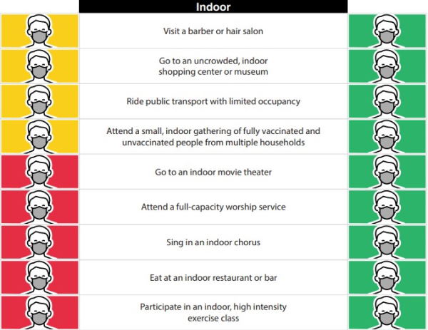 Indoor activities, such a getting a haircut, going to an indoor movie theater, eating at a restaurant, riding public transport and attending a house of worship are considered safe activities for fully vaccinated people so long as they are wearing a mask.
