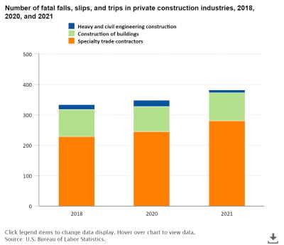 Data from BLS shows the construction industry accounted for 46.2% of all fatal falls, slips and trips in 2021. Fatalities among specialty trade contractors grew from 245 in 2020 to 281 in 2021, a 15% increase.