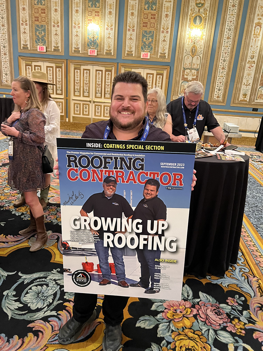 Photo No. 1: General Roofing President Shane Wakerling, holding an enlarged cover copy of Roofing Contractor magazine's October 2023 issue; his father, Mike, is the incoming WSRCA president.