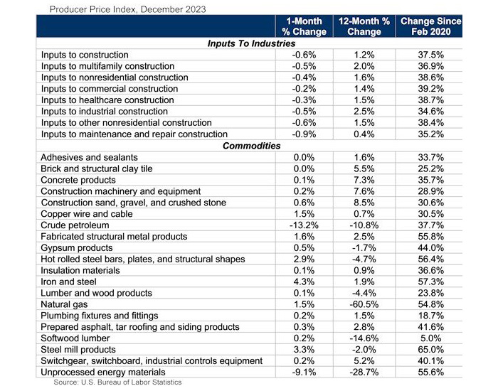 According to the Associated Builders and Contractors analysis of the U.S. Bureau of Labor Statistics Producer Price Index data, U.S. construction input prices decreased by 0.6% in December 2023 compared to the previous month. Nonresidential construction input prices decreased 0.4% for the month.