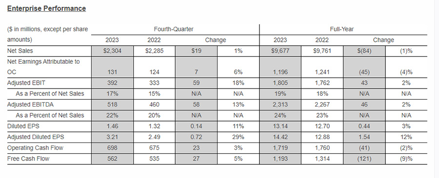 Owens Corning Celebrates Stellar Fourth-Quarter 2023; Solid Performance for the Year