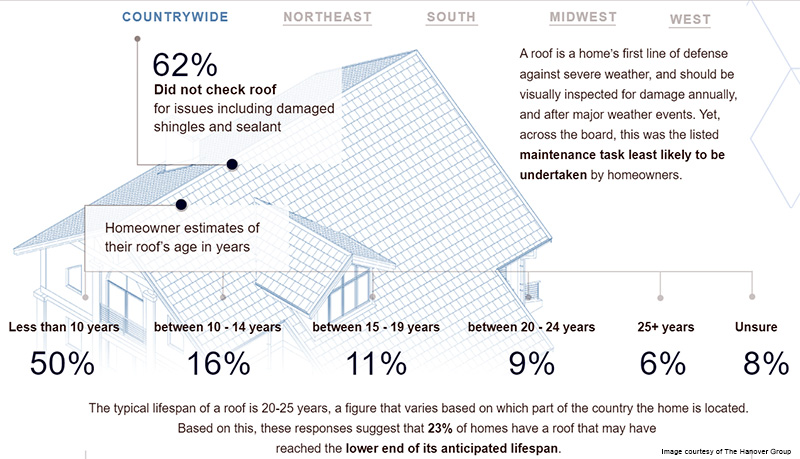 The report shows that, in the aggregate, less than 40% of survey respondents nationwide reported checking for roof issues, including damaged shingles and sealant. Hanover found that roof inspections were the maintenance task least likely to be undertaken by homeowners.