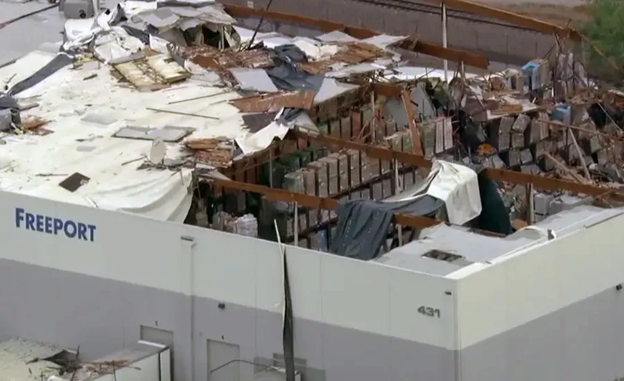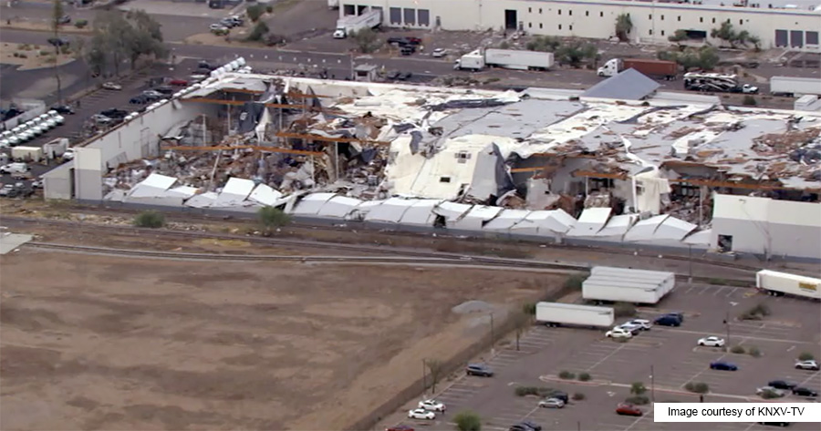 A devastating microburst hit the West Phoenix area last Wednesday evening, with wind gusts reported up to 77 miles per hour. The storm downed trees, inflicted severe damage to homes and buildings, and caused a warehouse roof system to fail, trapping a worker in the debris.