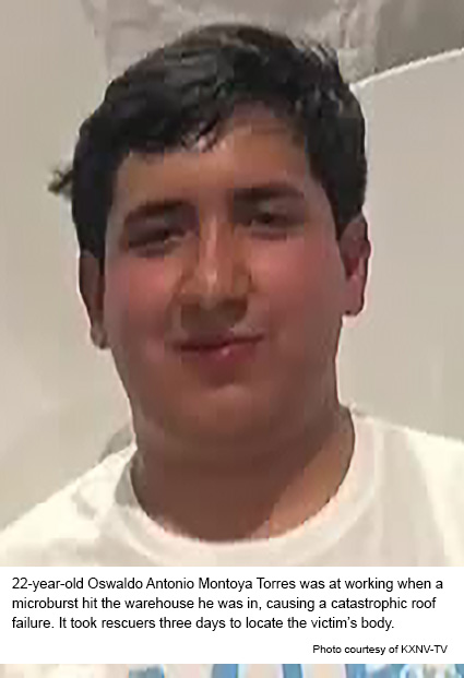 The microburst that caused part of a West Phoenix warehouse roof system to fail trapped 22-year-old Oswaldo Antonio Montoya Torres under tons of concrete and debris. Because of the fragility of the structure, it took rescue workers three days, working in 12-hour shifts, to locate the man’s body.